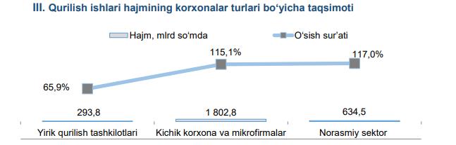 Norasmiy sektorda qurilish ishlarining ulushi 23,2 % ni yoki 634,5 mlrd so‘mni tashkil etib, 2024-yilning mos davriga nisbatan 117,0 % ni tashkil etdi.