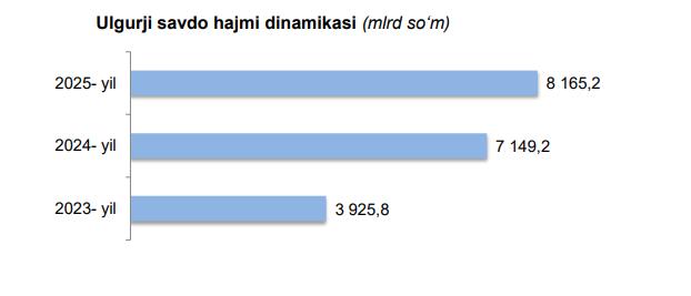 Viloyat bo‘yicha 2025-yilning yanvar-aprel oylarida ulgurji savdo tovar aylanmasi 8 165,2 mlrd so‘mni tashkil etib, 2024-yilning mos davriga nisbatan 9,0 % ga o‘sdi.