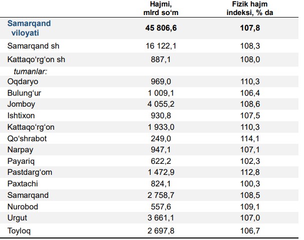 Dastlabki ma’lumotlar bo‘yicha 2025-yilning yanvar-oktabr oylarida viloyat korxonalari tomonidan 45 806,6 mlrd so‘mlik sanoat mahsulotlari ishlab chiqarilgan bo‘lib, 2024-yilning yanvar-oktabr oylariga nisbatan sanoat ishlab chiqarishining fizik hajmi indeksi 107,8 % ni tashkil etdi.