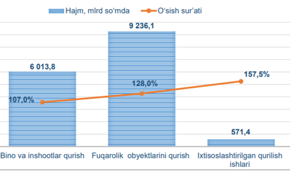 2025-yilning yanvar-oktabr oylarida Samarqand viloyatida bajarilgan qurilish ishlarining iqtisodiy faoliyat turlari bo‘yicha taqsimlanishi quyidagicha: - Iqtisodiy faoliyat turlari bo‘yicha qurilish ishlarining asosiy qismi turar joy va yashash uchun mo‘ljallanmagan binolarni qurish bo‘yicha amalga oshirilgan qurilish ishlaridan tashkil topdi. Ularning ulushi jami qurilish ishlari hajmida 38,0 % ni tashkil etdi va o‘tgan yilning mos davriga nisbatan 107,0 % ni tashkil etdi. - fuqarolik obyektlarini qurish yo‘nalishi 58,4 % ulushni tashkil etib, 2024-yilning mos davriga nisbatan 128,0 % ni tashkil etdi; - ixtisoslashtirilgan qurilish ishlari yo‘nalishi 3,6 % ulushni va 2024-yilning mos davriga nisbatan 157,5 % ni tashkil etdi.