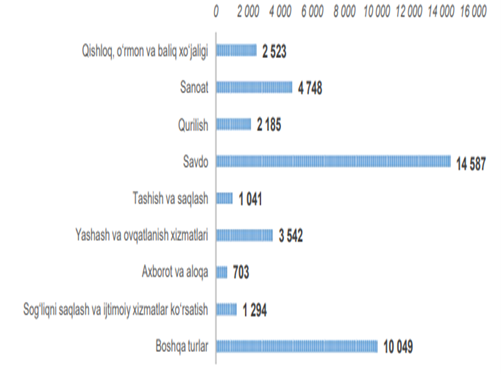 Iqtisodiy faoliyat turlari boʻyicha faoliyat yuritayotgan korxona va tashkilotlarning (tadbirkorlik subyektlari va kichik biznes subyektlarining) eng koʻp qismi “Savdo” tarmogʻida qolmoqda. Ularning ulushi 2025-yil 1-dekabr holatiga 35,9 foizni (42,3 foiz va 42,4 foiz) tashkil etdi