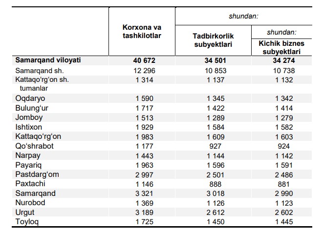 Samarqand viloyatining hududlari kesimida faoliyat koʻrsatayotgan korxona va tashkilotlar tahlil qilinganda eng ko‘p faol korxona va tashkilotlar Samarqand shahrida – 30,2 foiz, Samarqand – 8,2 foiz, Pastdarg‘om – 7,4 foiz, Urgut – 7,8 foiz va Payariq – 4,8 foiz tumanlariga to‘g‘ri kelmoqda.