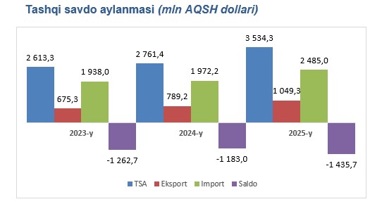 2025-yil yanvar-noyabr oylarida viloyatning tashqi savdo aylanmasi (matnda TSA) 3 534,3 mln AQSH dollariga yetdi va 2024-yilning yanvar-noyabr oylariga nisbatan 772,9 mln AQSH dollariga yoki 28,0 % ga ko‘paydi.