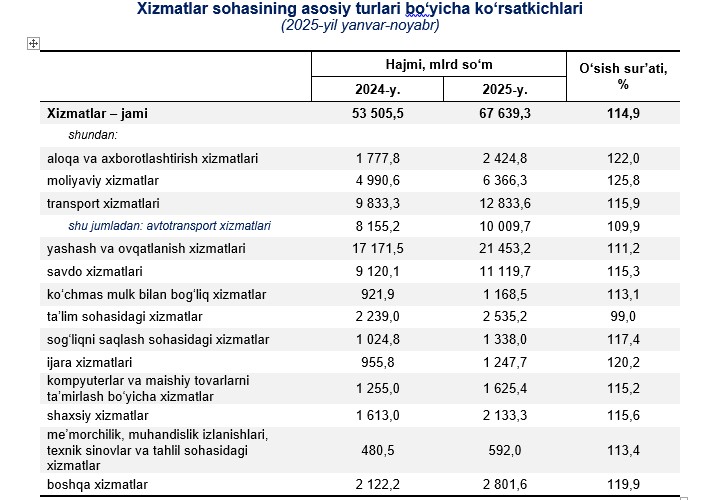 Samarqand viloyati bo‘yicha ko‘rsatilgan bozor xizmatlari umumiy hajmining o‘sishida moliyaviy xizmatlar 25,8 % ga (ko‘rsatilgan xizmatlar umumiy hajmining o‘sishiga hissasi 2,6 bandni tashkil etdi), aloqa va axborotlashtirish xizmatlari 22,0 % ga (o‘sishiga hissasi 0,9 band), ijara xizmatlari 20,2 % ga (o‘sishiga hissasi 0,4 band), sogʻliqni saqlash sohasidagi xizmatlari 17,4 % ga (o‘sishiga hissasi 0,4 band), boshqa xizmatlari 19,9 % ga (o‘sishiga qo‘shgan hissasi 0,8 band) va kompyuterlar va maishiy tovarlarni taʼmirlash boʻyicha xizmatlar 15,2 % ga (o‘sishiga hissasi 0,4 band) asosiy omili bo‘lib hisoblanadi.