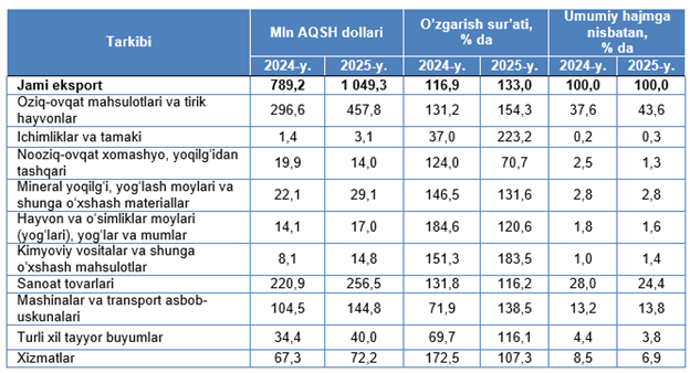 Eksport tarkibida tovarlar ulushi 93,1 % ni tashkil etib, asosiy ulush oziq-ovqat mahsulotlari va tirik hayvonlar (43,6 %), sanoat tovarlari (24,4 %), mashinalar va transport asbob-uskunalari (13,8 %) va turli xil tayyor buyumlar (3,8 %) hissasiga to‘g‘ri kelmoqda.