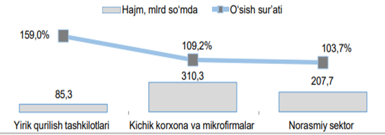 Yirik qurilish tashkilotlari tomonidan 2026-yilning yanvar oyida bajarilgan qurilish ishlari hajmi 85,3 mlrd so‘mni tashkil etdi. Ko‘rib chiqilayotgan davrda qurilish ishlari hajmi 2025-yilning mos davriga nisbatan 159,0 % ni va ularning umumiy hajmdagi ulushi 14,1 % ni tashkil etdi. Shuningdek, kichik korxona va mikrofirmalar tomonidan bajarilgan qurilish ishlari hissasiga jami qurilish ishlari hajmining 51,4 % i to‘g‘ri kelib, ular hissasiga to‘g‘ri kelgan qurilish ishlari hajmi 2025-yilning mos davriga nisbatan 109,2 % ni tashkil etgan holda 310,3 mlrd so‘m miqdorida qayd etildi. Norasmiy sektorda qurilish ishlarining ulushi 34,5 % ni yoki 207,7 mlrd so‘mni tashkil etib, 2025-yilning mos davriga nisbatan 103,7 % ni tashkil etdi.