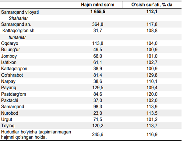 Samarqand viloyatidagi hududlar kesimida bajarilgan qurilish ishlari hajmi