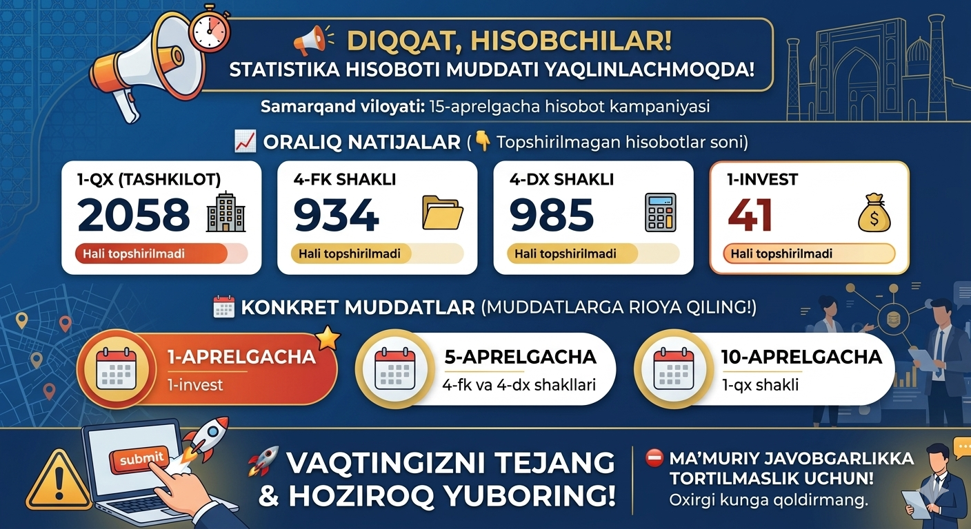📢 Diqqat, hisobchilar! Statistika hisobotlarini topshirish muddati yaqinlashmoqda!