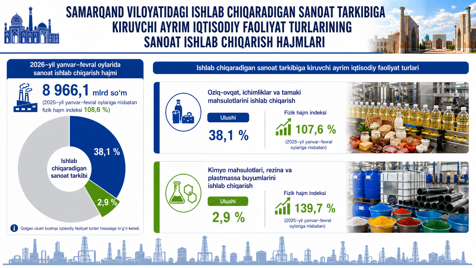 Ishlab chiqaradigan sanoat tarkibida oziq-ovqat, ichimliklar va tamaki mahsulotlarini ishlab chiqarishning ulushi – 38,1 % (2025-yilning yanvar-fevral oylariga nisbatan fizik hajm indeksi 107,6 %), kimyo mahsulotlari, rezina va plastmassa buyumlarini ishlab chiqarishning ulushi – 2,9 % (2025-yilning yanvar-fevral oylariga nisbatan fizik hajm indeksi 139,7 %)ni tashkil etdi.