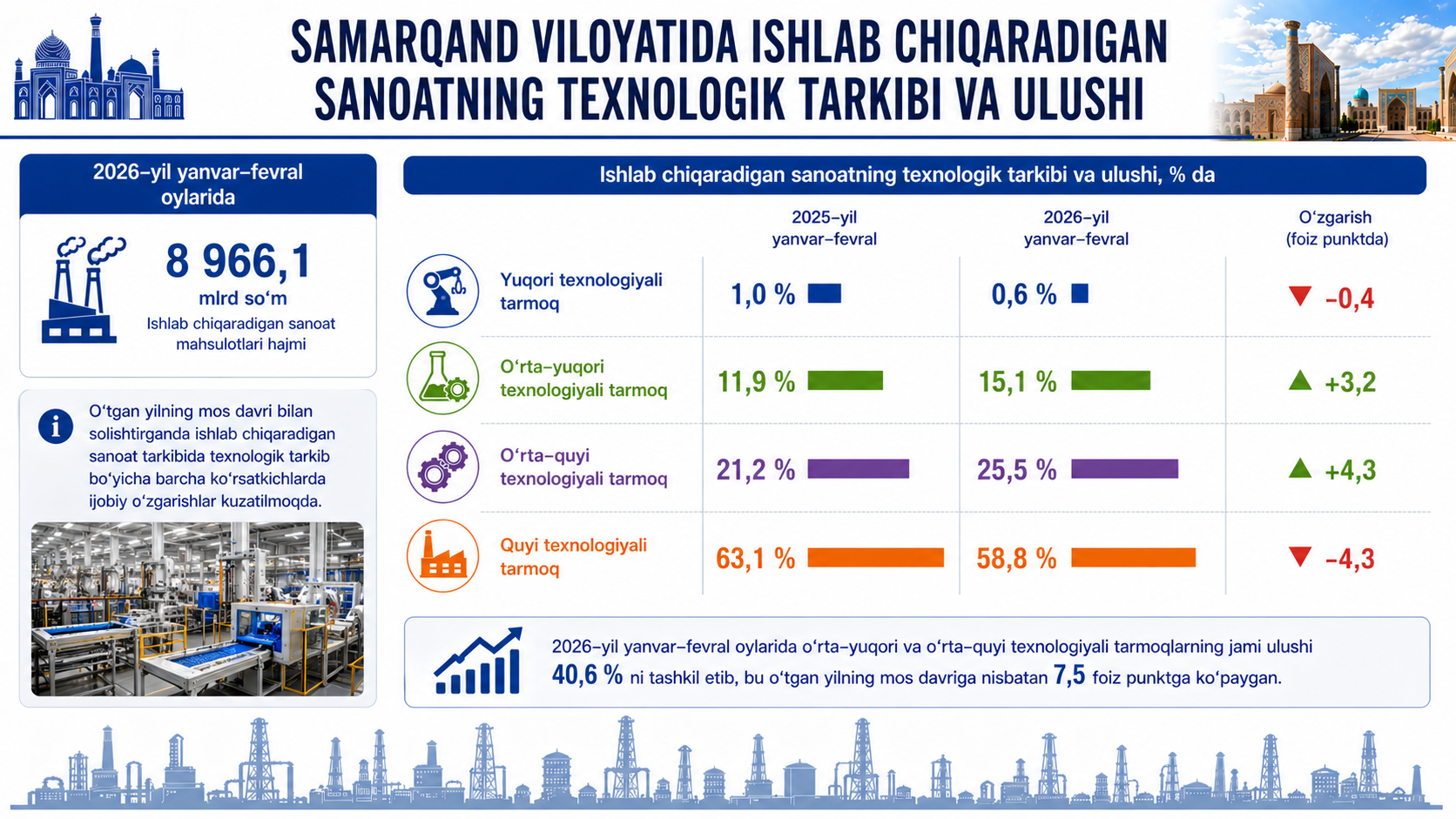 O‘tgan yilning mos davri bilan solishtirganda ishlab chiqaradigan sanoat tarkibida yuqori texnologiyali tarmoqning ulushi 0,6 % ni (2025-yilning yanvar-fevral oylarida 1,0 %), o‘rta-yuqori texnologiyali – 15,1 % (11,9 %), o‘rta-quyi texnologiyali – 25,5 % (21,2 %), quyi texnologiyali 58,8 % (63,1 %)ni tashkil etgan.