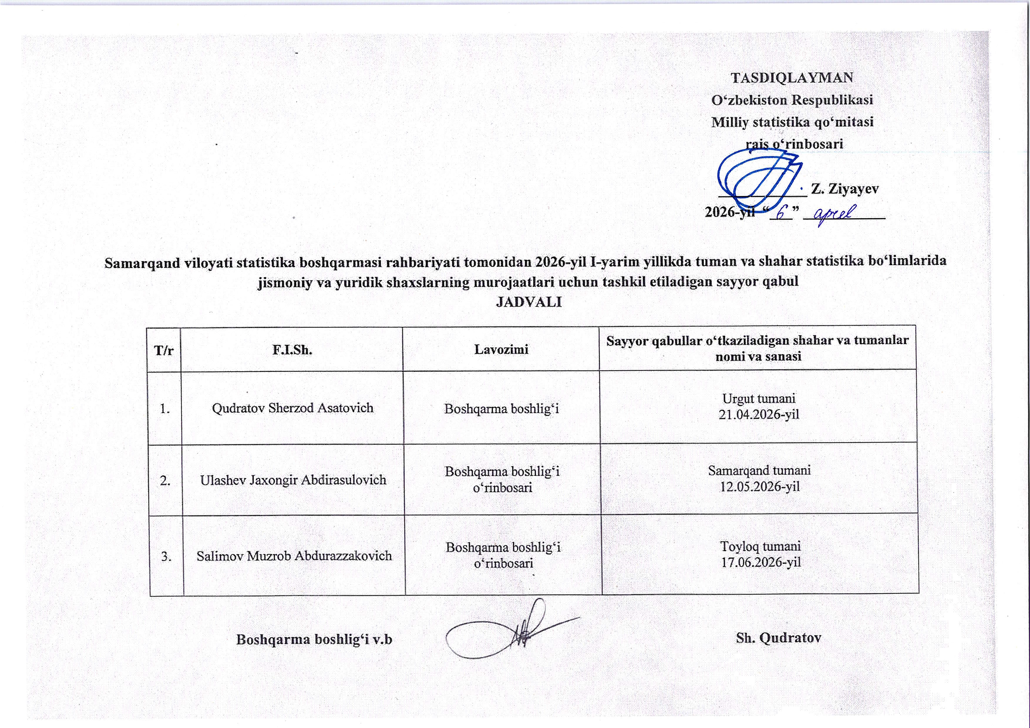Samarqand viloyati statistika boshqarmasi rahbarlarining 2025- yil II-yarim yillikda