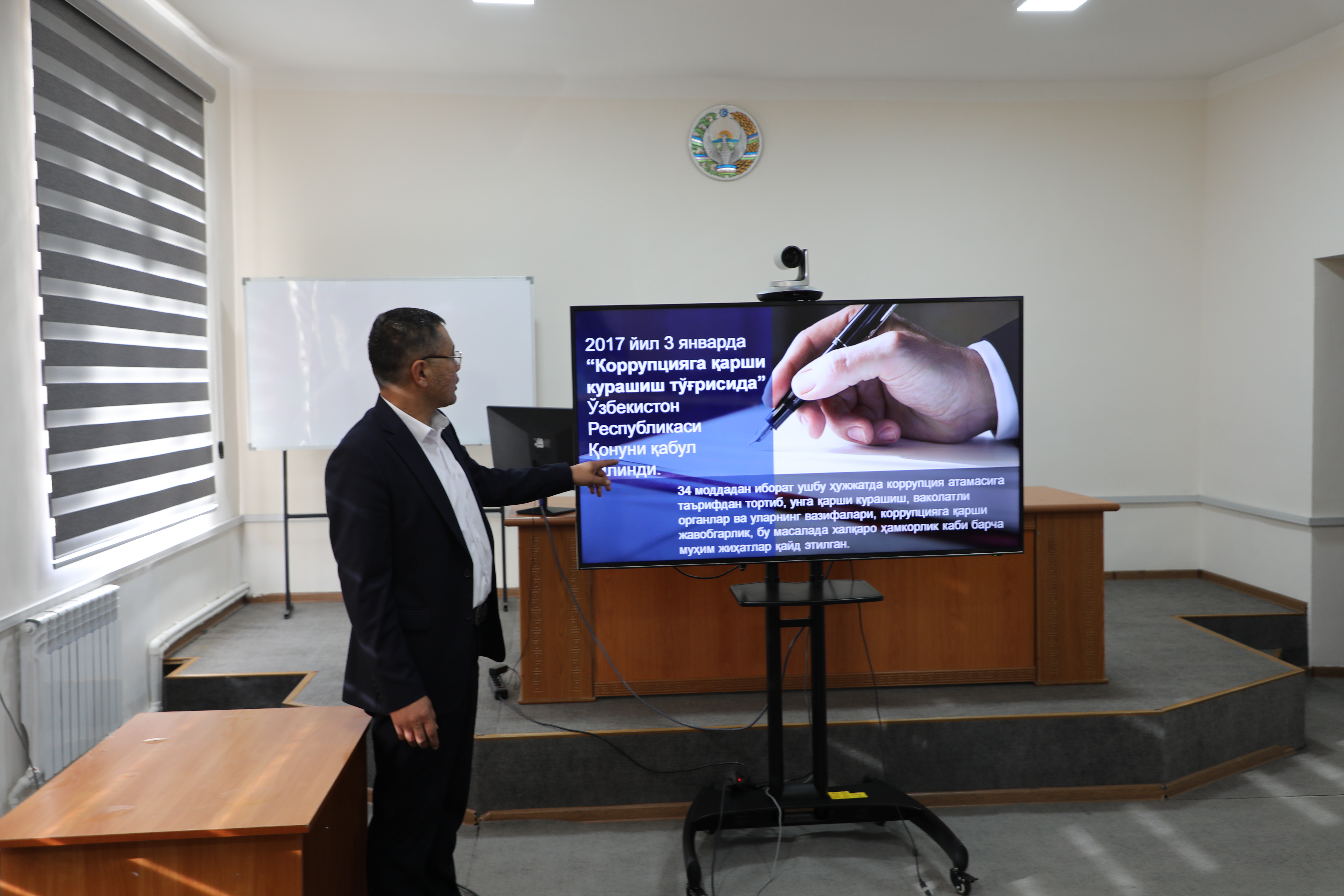 Shundan so‘ng, Davlat xavfsizlik xizmati boshqarmasi xodimi so‘zga chiqib, O‘zbekiston Respublikasi Prezidenti Shavkat Mirziyoyevning Korrupsiyaga qarshi kurashish milliy kengashi yig‘ilishida qatnashganligini ma’lumot o‘rnida ta’kidlab, yig‘ilishda yurtimizda korrupsiyadan xoli muhit yaratish bo‘yicha qilingan ishlarga baho berib o‘tishdi. Shuningdek, kelgusi vazifalar belgilab berilganligi to‘g‘risida ishtirokchilarga batafsil tushuntirish berib o‘tishdi.