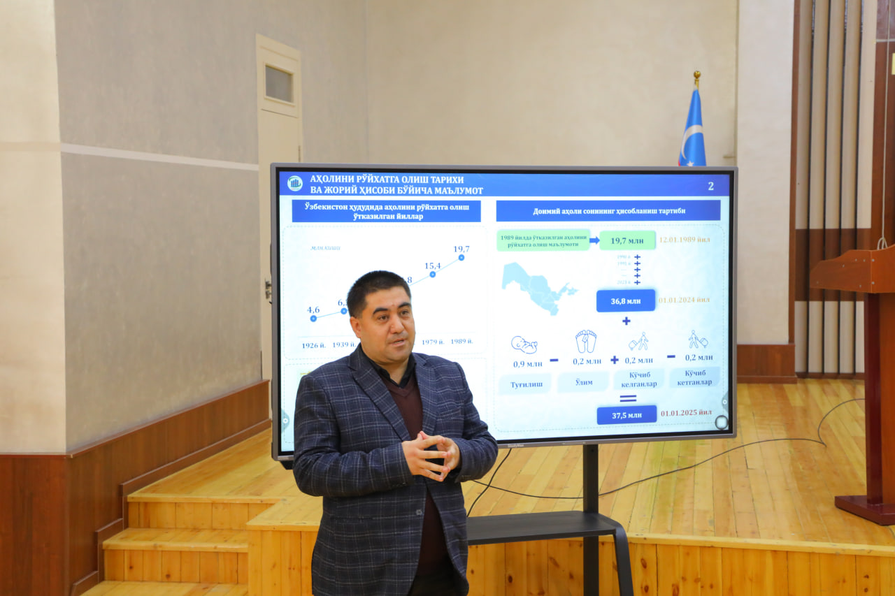 2025-yil 18-noyabr kuni Samarqand viloyatida O‘zbekiston Respublikasi Prezidentining 2025-yil 19-sentabrdagi “Aholi va qishloq xo‘jaligini ro‘yxatga olish tadbirini o‘tkazish to‘g‘risida”gi 173-sonli Farmoni 8-bo‘lim “B” bandi ijrosini ta’minlash maqsadida oliy ta’lim muassasalari o‘qituvchi va murabbiylari uchun seminar tashkil etildi.