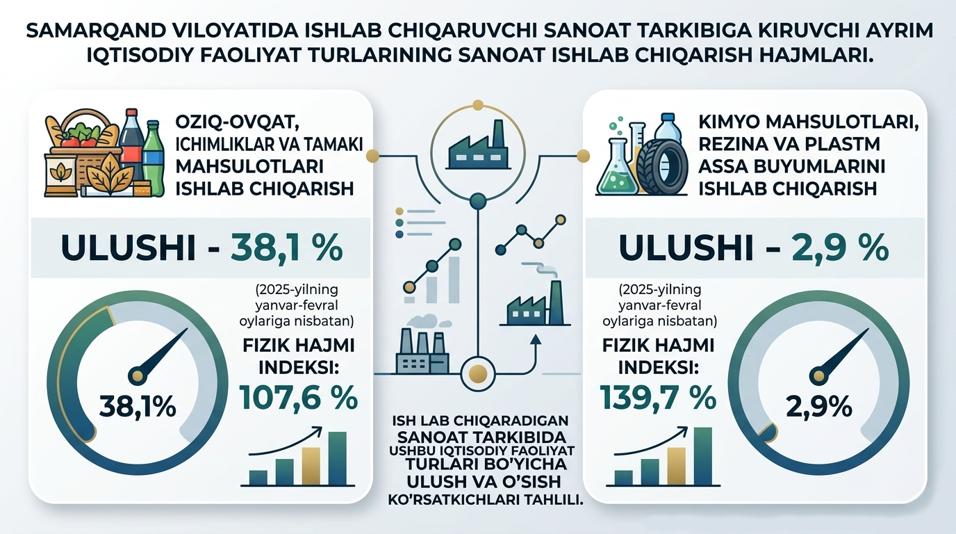 Ishlab chiqaradigan sanoat tarkibida oziq-ovqat, ichimliklar va tamaki mahsulotlarini ishlab chiqarishning ulushi – 38,1 % (2025-yilning yanvar-fevral oylariga nisbatan fizik hajm indeksi 107,6 %), kimyo mahsulotlari, rezina va plastmassa buyumlarini ishlab chiqarishning ulushi – 2,9 % (2025-yilning yanvar-fevral oylariga nisbatan fizik hajm indeksi 139,7 %)ni tashkil etdi.