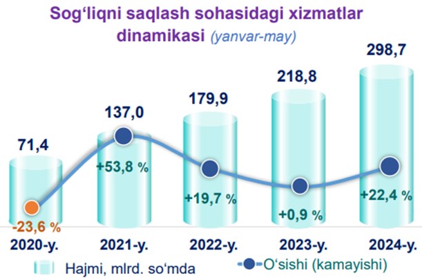 2024-yilning yanvar-may oylarida sog‘liqni saqlash xizmatlari hajmi 298,7 mlrd. so‘mni yoki ko‘rsatilgan bozor xizmatlari umumiy hajmining 2,3 % ni tashkil etdi.