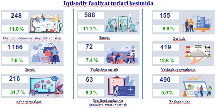 2024-yil yanvar-may oylarida yangi tashkil etilgan korxona va tashkilotlar soni 3 417 tani tashkil etmoqda.