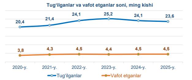 Viloyatimizda 2025-yilning yanvar-mart oylarida qayd etilgan tirik tugʻilganlar soni 23,6 ming kishini, har ming aholiga nisbatan tugʻilish koeffitsiyenti 22,2 promilleni tashkil etdi. Tugʻilganlar soni joriy yilning yanvar-mart oylarida 2024-yilning mos davriga nisbatan 0,5 ming nafarga kamaygan.