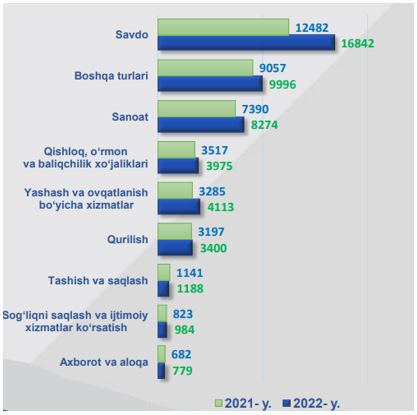 Faoliyat ko‘rsatayotgan korxona va tashkilotlarning iqtisodiy faoliyat turlari bo‘yicha tahlil qilib qaraydigan bo‘lsak eng ko‘p ulush savdo faoliyatiga to‘g‘ri kelmoqda.