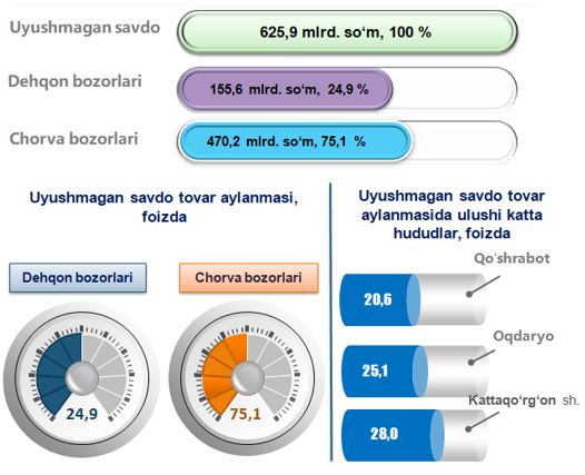 Viloyat bo‘yicha 2022-yilning yanvar-aprel oylarida uyushmagan savdo tovar aylanmasi 625,9 mlrd. so‘mni tashkil etib, 2021-yilning mos davriga nisbatan 9,6 foizga ko‘paydi. Shu jumladan, 1-bozor va 1-bozor (chorva) (oylik) kuzatuvlari ma’lumotlariga asosan, dehqon bozorlarida savdo faoliyati bilan shug‘ullanuvchi jismoniy shaxslarning uy xo‘jaliklarida yetishtirgan mahsulotlarini sotish hajmi 155,6 mlrd. so‘mni (o‘zgarish sur’ati 115,1 %), chorva mollari va parrandalar sotuvchi jismoniy shaxslarning savdo aylanmasi hajmi 470,2 mlrd. so‘mni (o‘zgarish sur’ati 107,9 %) tashkil etdi.