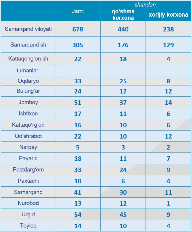 Samarqand viloyatida chet el investitsiyasi ishtirokidagi korxona va tashkilotlar toʻgʻrisida maʼlumotlar