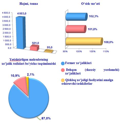 2022–yilning yanvar–iyun oylarida barcha toifadagi xo‘jaliklar tomonidan 4599 tonna uzum (2021–yilning yanvar–iyuniga nisbatan 2,3 % ga kam) yetishtirildi. Uzum yetishtirish ko‘rsatkichlarini xo‘jaliklar toifalari bo‘yicha tahlil qilganimizda, uzum yetishtirish umumiy hajmidan 87,0 foizi fermer xo‘jaliklari hissasiga to‘g‘ri kelishini ko‘rsatmoqda.