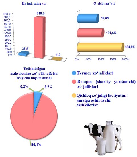 2022–yilning yanvar–iyun oylarida barcha toifadagi xo‘jaliklar tomonidan 657,5 ming tonna sut (2021– yilning yanvar–iyuniga nisbatan 0,1 % ga ko‘p) yetishtirilgan. Sut yetishtirish ko‘rsatkichlarini xo‘jalik toifalari bo‘yicha tahlil qilinganda, sut yetishtirish umumiy hajmidan 94,1 %i dehqon (shaxsiy yordamchi) xo‘jaliklari hissasiga to‘g‘ri kelishini ko‘rsatmoqda.