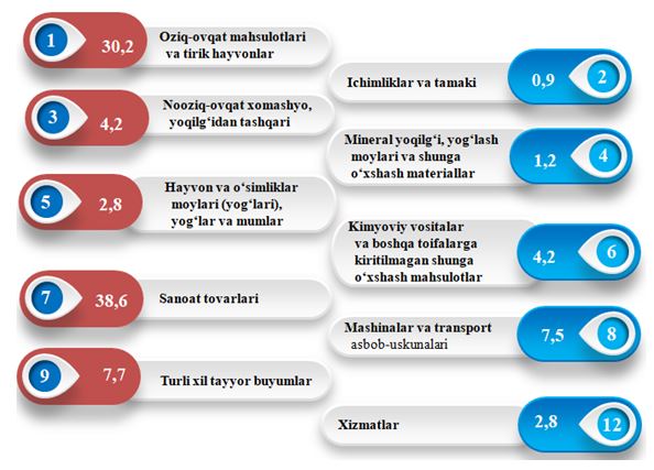 Eksport tarkibida tovarlar ulushi 97,2 foizni tashkil etib, sanoat tovarlari (38,6 %) oziq-ovqat mahsulotlari va tirik hayvonlar (30,2 %), hamda turli xil tayyor buyumlar (7,7 %) hissasiga toʻgʻri kelmoqda.