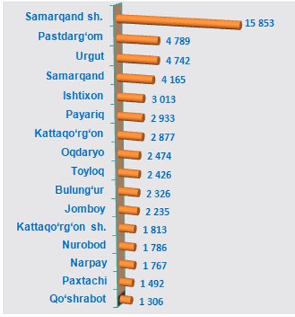 2022- yil 1- sentabr holatiga ko‘ra ro‘yxatdan o‘tgan korxona va tashkilotlar hududlar kesimida taqsimlanganda ularning, jami 55 997 ta soniga nisbatan hududlarlagi ulushi, Samarqand shahrida (28,3%),Urgut (8,5%), Pastdarg‘om (8,6%), Samarqand (7,4%), Ishtixon (5,4%), Payariq (5,2%), Kattaqo‘rg‘on (5,1%), Oqdaryo (4,4%), Toyloq (4,3%), Bulung‘ur (4,2%), Jomboy (4,0%), Kattaqo‘rg‘on shahri (3,2%), Narpay (3,2%), Nurobod (3,2%), Paxtachi (2,7%) va Qo‘shrabot (2,3%) tumanlari hissasiga to‘g‘ri keldi.