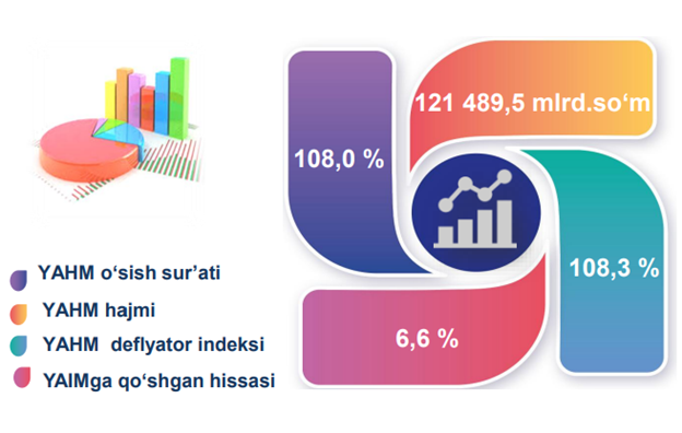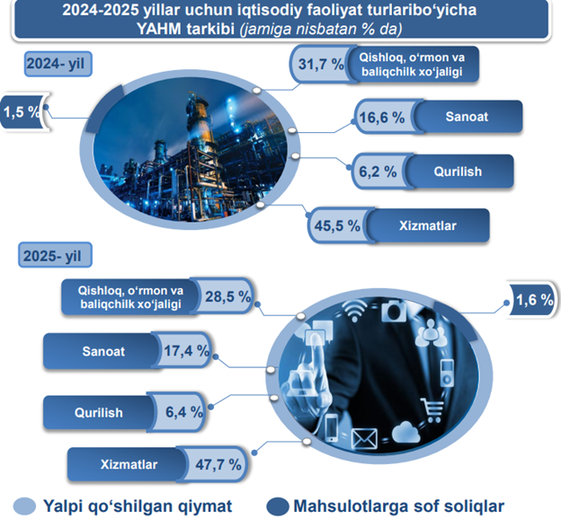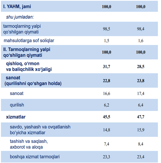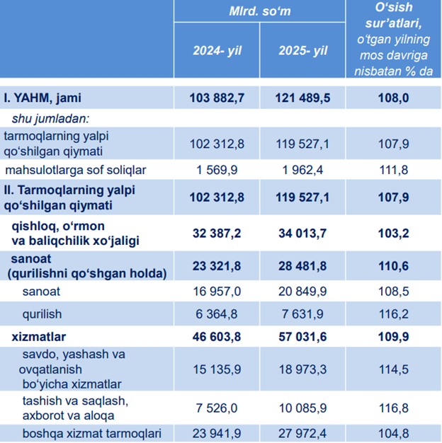 2025- yil uchun hudud iqtisodiyotining barcha tarmoqlarida yaratilgan yalpi qo‘shilgan qiymat (YAQQ) hajmi umumiy YAHMning 98,4 % ini, mahsulotlarga