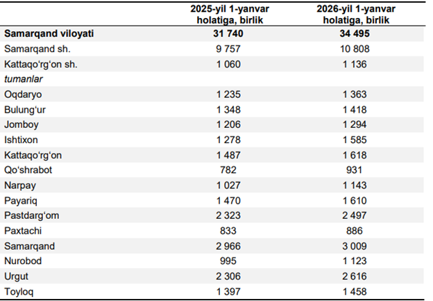 Milliy statistika qo‘mitasi ma’lumotlariga ko‘ra, 2026-yilning 1-yanvar holatiga O‘zbekistonda har 1 000 aholiga 31,7 ta tadbirkorlik subyektlari to‘g‘ri keladi.