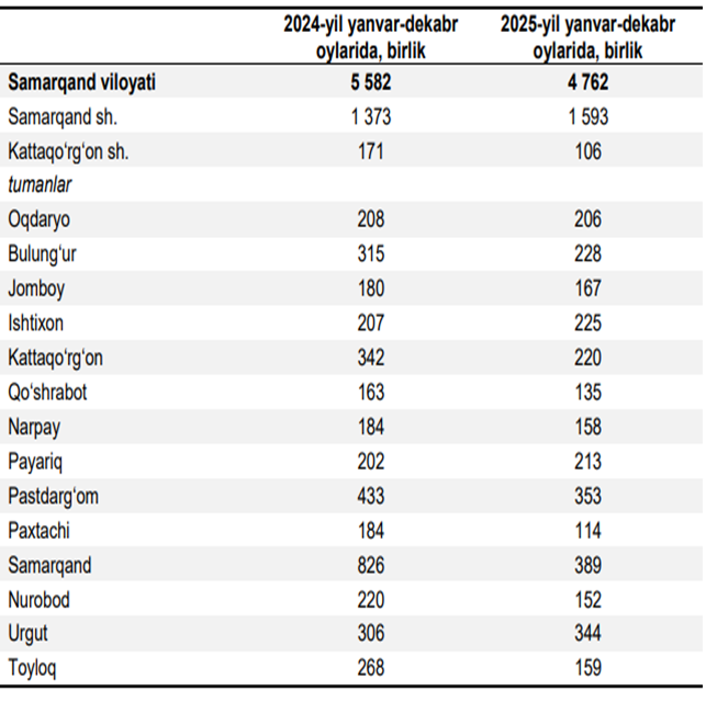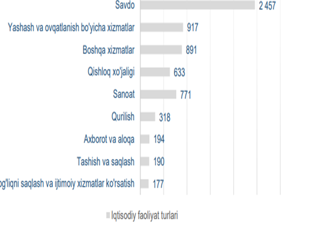 2025-yilning yanvar-dekabrida 6,5 mingta yangi kichik korxona va mikrofirmalar (fermer va dehqon xo‘jaliklarisiz) tashkil qilindi. Iqtisodiy faoliyat turlari boʻyicha