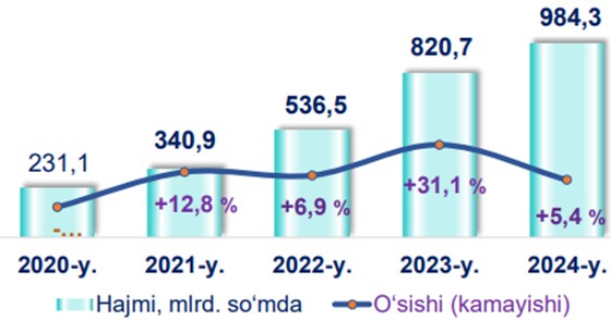 Ushbu ko‘rsatkichni hududlar kesimida solishtirganda eng yuqori hajm Samarqand shahri (2 985,6 mlrd so‘m)