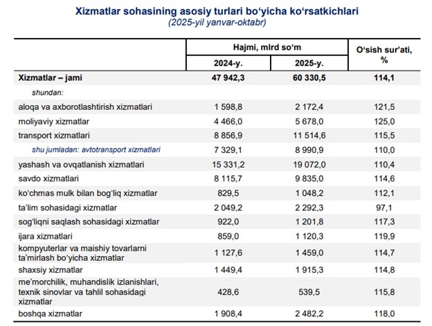 2025-yilning yanvar-oktabr oylari yakuni bilan xizmatlar importi hajmi 5,8 mln AQSH dollarini yoki jami import hajmining 0,3 % ini tashkil etdi va o‘tgan