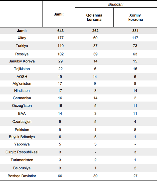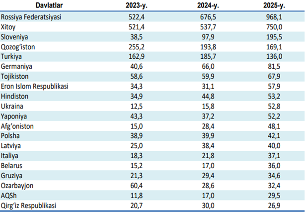 Milliy statistika qo‘mitasi ma’lumotlariga ko‘ra, O‘zbekistonga 2025-yilning yanvar-oktabr oylarida 21 ta xorijiy davlatdan qiymati 83,1 mln AQSH dollariga teng bo‘lgan qariyb 13,5 ming tonna