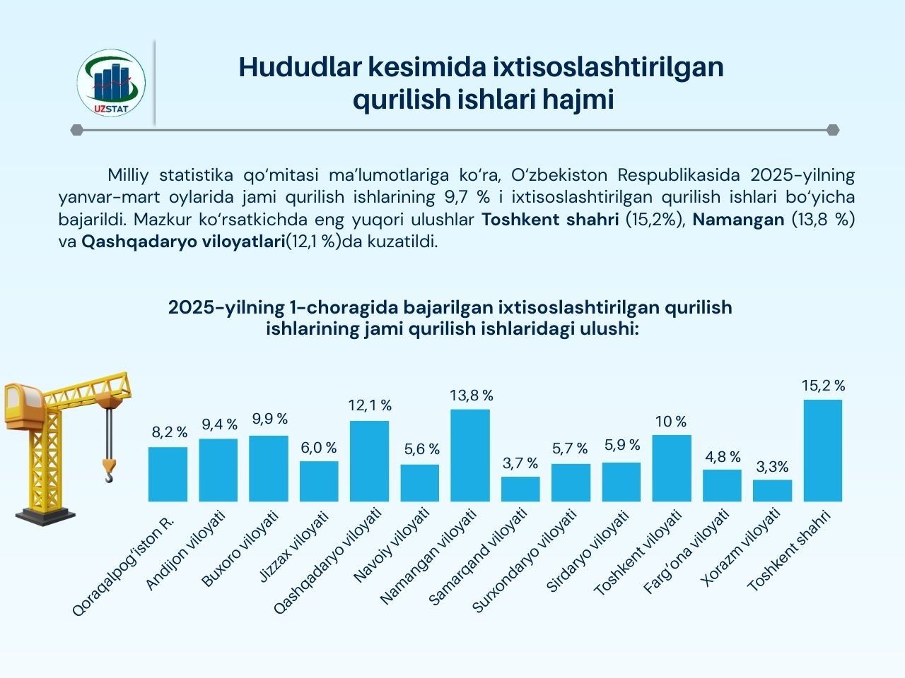 2025-yilning yanvar-oktabr oylarida Samarqand viloyatida bajarilgan qurilish ishlarining iqtisodiy faoliyat turlari bo‘yicha taqsimlanishi quyidagicha: - Iqtisodiy faoliyat turlari bo‘yicha qurilish ishlarining asosiy qismi turar joy va yashash