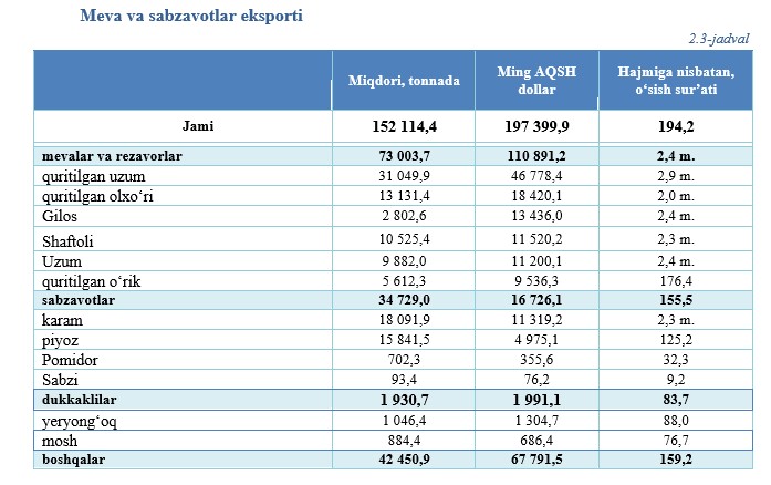 2025-yil yanvar-avgust oylarida Samarqand viloyati bo‘yicha, oziq-ovqat mahsulotlarining asosiy qismi bo‘lgan 197,5 mln AQSH dollari qiymatidagi meva-