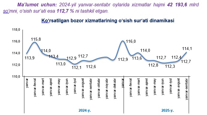 2024-yilning yanvar-sentabr oylariga nisbatan (9 946,9 ming so‘m) 2025-yilning mos davrida aholi jon boshiga ko‘rsatilgan bozor xizmatlari hajmi 2 327,2 ming