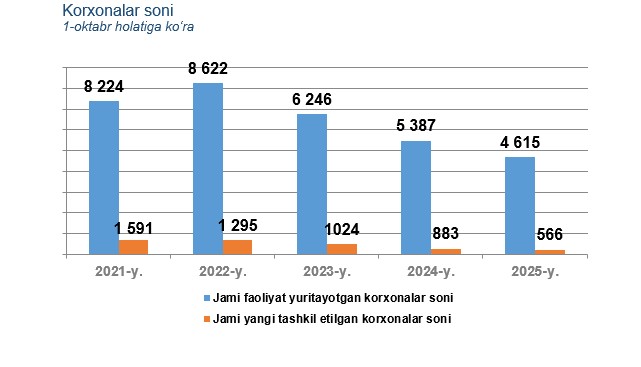 Milliy statistika qo‘mitasi ma’lumotlariga ko‘ra, 2025-yilning 1-oktyabr holatiga respublikada faoliyat ko‘rsatayotgan korxona va tashkilotlar soni 460,3 mingtani tashkil etgan.