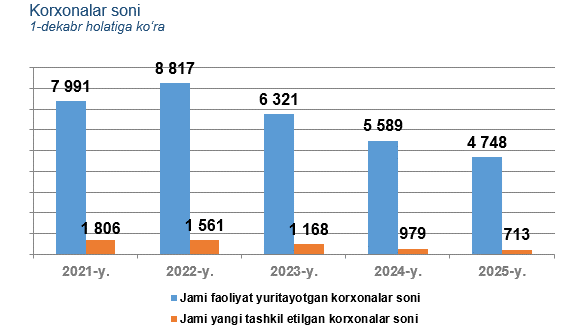 Milliy statistika qo‘mitasi ma’lumotlariga ko‘ra, 2025-yilning 1-dekabr holatiga O‘zbekistonda 471,7 mingta korxona va tashkilotlar faoliyat yuritmoqda.