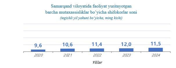 2024-yil yakuniga koʻra, Samarqand viloyatida faoliyat yuritayotgan barcha mutaxassisliklar boʻyicha shifokorlar soni 11,5 ming kishini tashkil etdi va 2023-