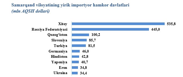 2025-yil yanvar-avgust oylarida Samarqand viloyati 95 ta davlatdan tovar va xizmatlar importini amalga oshirdi. Yirik hamkor davlatlar XXR (29,8 %), Rossiya