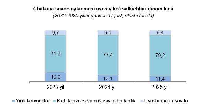 Kichik biznes subyektlarining ulgurji savdo aylanmasidagi umumiy hajmi 10 038,3 mlrd so‘mni tashkil qilib, 2024-yilning mos davriga nisbatan o‘sish