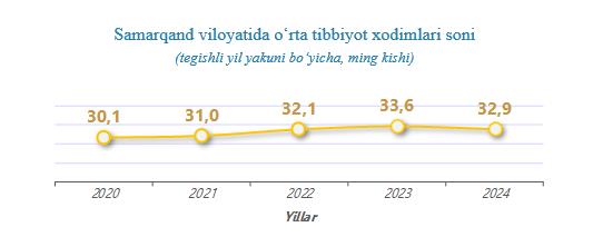 2024-yil yakunida Samarqand viloyatida oʻrta tibbiyot xodimlari soni 32,9 ming kishini tashkil etdi va 2023-yilga nisbatan 0,7 ming kishiga, yaʼni