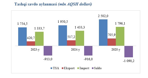 2025-yil yanvar-avgust oylarida viloyatning tashqi savdo aylanmasi (matnda TSA) 2 502,0 mln AQSH dollariga yetdi va 2024-yilning yanvar-avgust oylariga