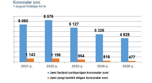 Milliy statistika qo‘mitasi ma’lumotlariga ko‘ra, 2025-yil 1-sentabr holatiga respublikada faoliyat ko‘rsatayotgan korxona va tashkilotlar soni 465,6 mingtani