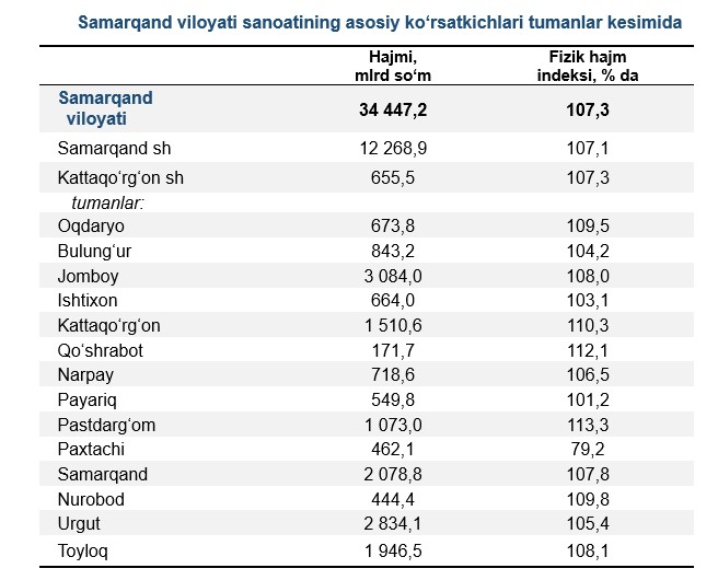 Samarqand viloyati Statistika boshqarmasining dastlabki maʼlumotlariga koʻra, 2025-yilning yanvar-avgust oylarida Samarqand viloyatining iqtisodiy holati quyidagicha, o‘sish sur’ati o‘tgan yilning mos davriga nisbatan olingan: