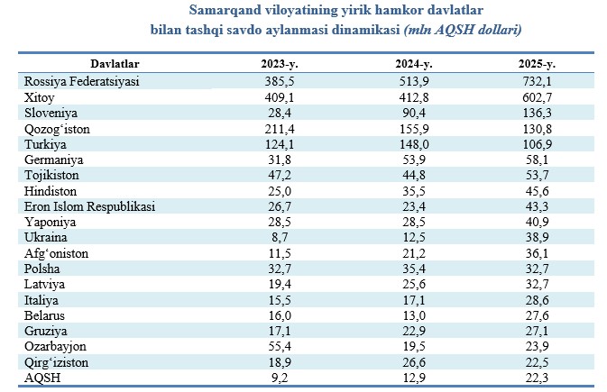 Samarqand viloyati jahonning 110 mamlakati bilan savdo aloqalarini amalga oshirib kelmoqda. TSAning nisbatan salmoqli hissasi Rossiyada (29,3 %), XXRda
