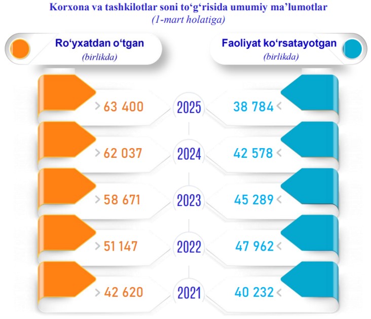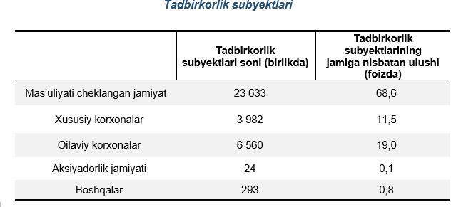 2025-yil 1-sentabr holatiga ko‘ra, 34 492 ta faol tijorat korxonalaridan 23 633 tasini mas’uliyati cheklangan jamiyatlar tashkil etgan bo‘lib, ular tashkiliy-