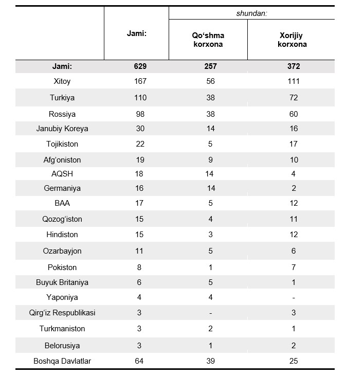 Milliy statistika qo‘mitasi ma’lumotlariga ko‘ra, 2025-yilning yanvar-iyul oylarida O‘zbekistonga 17 ta xorijiy davlatlardan qiymati 20,9 mln AQSH