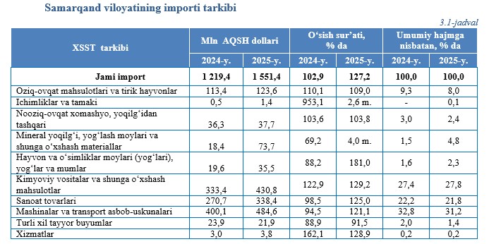 2025-yilning yanvar-iyul oylarida import hajmi 1 551,4 mln AQSH dollariga yetdi va 2024-yilning mos davriga nisbatan 27,2 % ga ko‘paydi. Import tarkibida